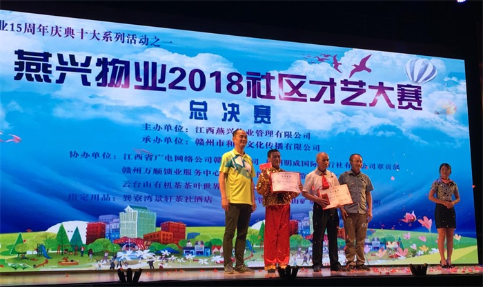 本屆社區(qū)才藝大賽是燕興物業(yè)成立十五周年系列慶典活動之一,于今年7月1日在章貢區(qū)江濱御景小區(qū)舉辦第一場比賽,并先后在南昌、吉安、上猶、贛縣、章貢區(qū)等項(xiàng)目小區(qū)舉辦了14場初賽,一共吸引了1500多名小區(qū)業(yè)主熱情參與,參賽選手既有67歲的阿姨,也有6歲的小朋友。通過初賽優(yōu)選出30個(gè)節(jié)目參加復(fù)賽,最終有12個(gè)節(jié)目成功晉級,參加今晚的決賽。參賽選手們以飽滿的熱情,生動的語言,夸張的肌體,抒發(fā)對生活的熱愛,分享對藝術(shù)的感受。