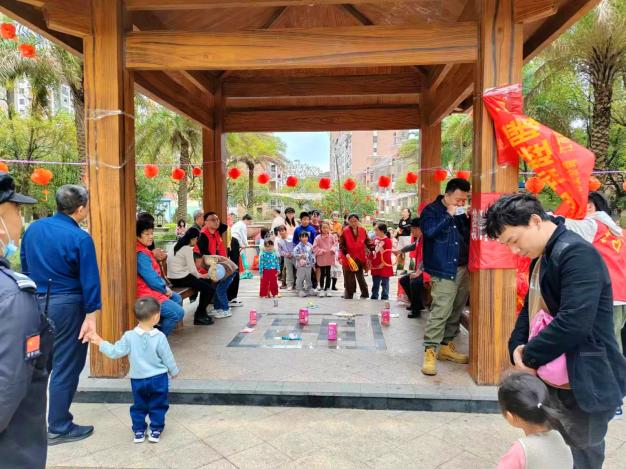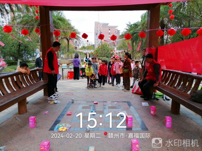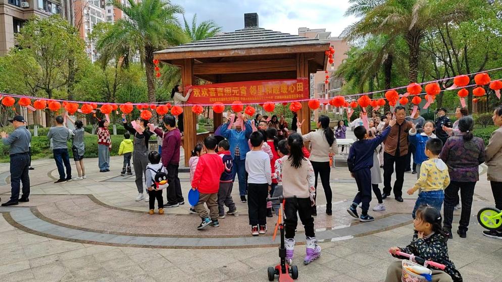 贛州嘉福國際小區聯合泥灣里社區開展“歡歡喜喜鬧元宵 鄰里和睦暖心田”猜燈謎游園活動,一排排懸掛的彩色燈謎條渲染出喜慶的節日氛圍,妙趣橫生的燈謎吸引眾多業主前來參與,有趣的小游戲吸引孩子們駐足游玩。只見業主們帶著孩子,穿梭在懸掛的燈籠中,看謎面、猜謎語、玩游戲,現場一片歡聲笑語,共同度過其樂融融的歡樂時光。