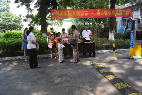 為全力配合贛州市創建全國文明城市活動,燕興物業在管轄小區內向廣大業主開展了宣傳活動,在宣傳欄內張貼了遵德守禮提示牌,在小區主大門前懸掛了宣傳文明條幅,成立了志愿服務隊,設立了“志愿服務站”。