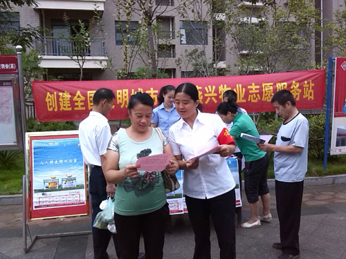 春江花月小區志愿服務隊向廣大業主放發創建全國文明活動宣傳單