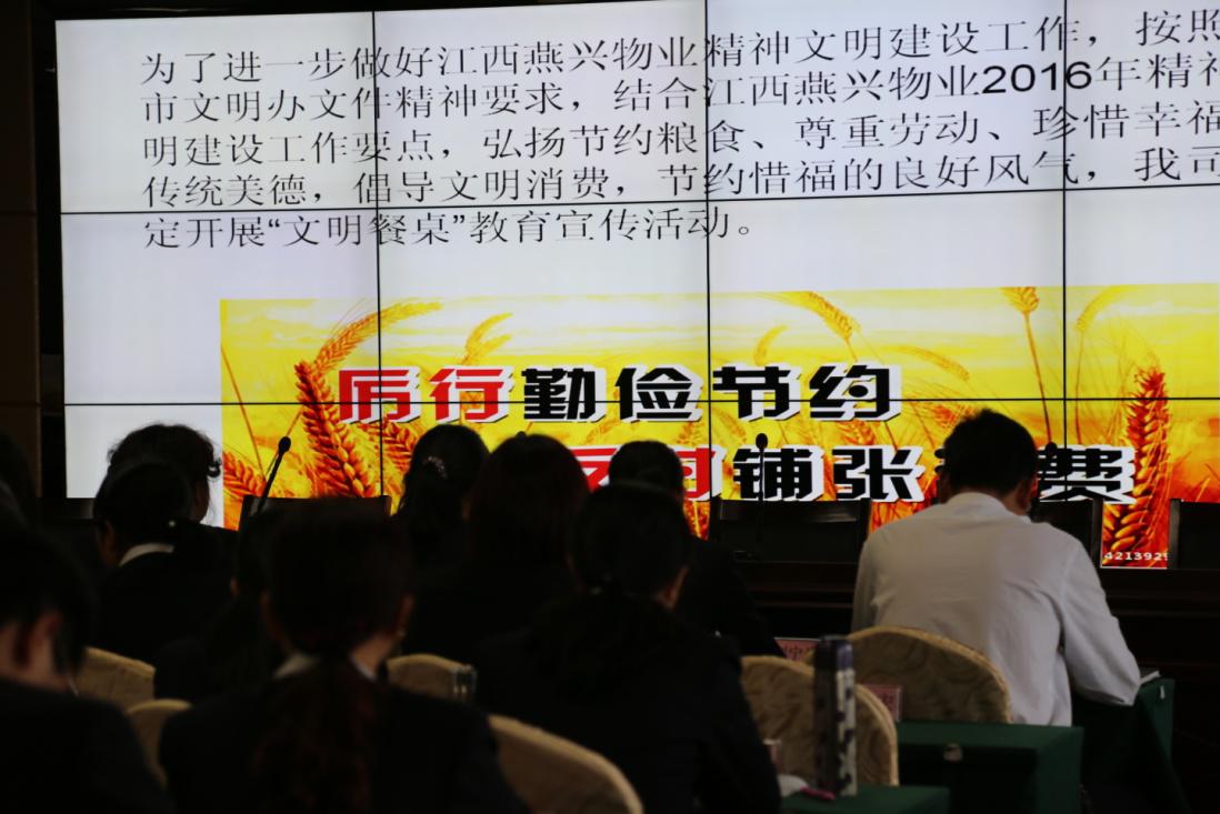 2016年4月16日,江西燕興物業(yè)在會(huì)議室開展了文明餐桌教育宣傳活動(dòng),活動(dòng)內(nèi)容圍繞“節(jié)儉惜福 文明用餐”的主題展開,倡導(dǎo)廣大員工樹立積極向上、科學(xué)健康的生活方式,傳承中華民族傳統(tǒng)美德,做到合理消費(fèi),文明用餐。
