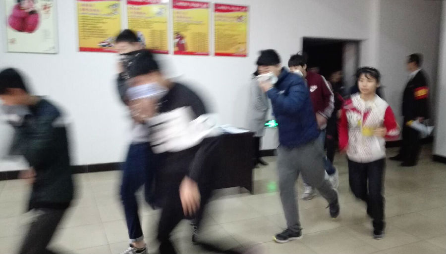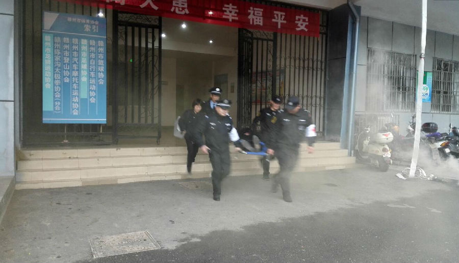 一培訓完,參加演練的全體人員整裝列隊,在演練總指揮的一聲令下,演練正式開始。這次演練的主要內容為通訊報警、警戒保障、疏散救護和行動滅火。現場模擬體育中心某處冒出滾滾濃煙,物業公司接到火警報告后,立即啟動火災應急處置預案,通訊聯絡組、疏散警戒組、滅火行動組、后勤救護組按照預案立刻展開行動。通訊聯絡組立即撥打119、120救援電話;疏散警戒組立刻對各路口進行警戒封鎖,組織被困人員沿著設定的逃生路線有序撤出大樓;滅火行動組第一時間帶著消防水帶、滅火器等消防器材趕到火災地點,將大火有效控制直至撲滅;后勤救護組對在火災現場受傷的人員進行救護,傷情較重的用擔架抬出至安全地帶進行救治……各個環節臨危不亂,環環相扣,操作嚴謹。