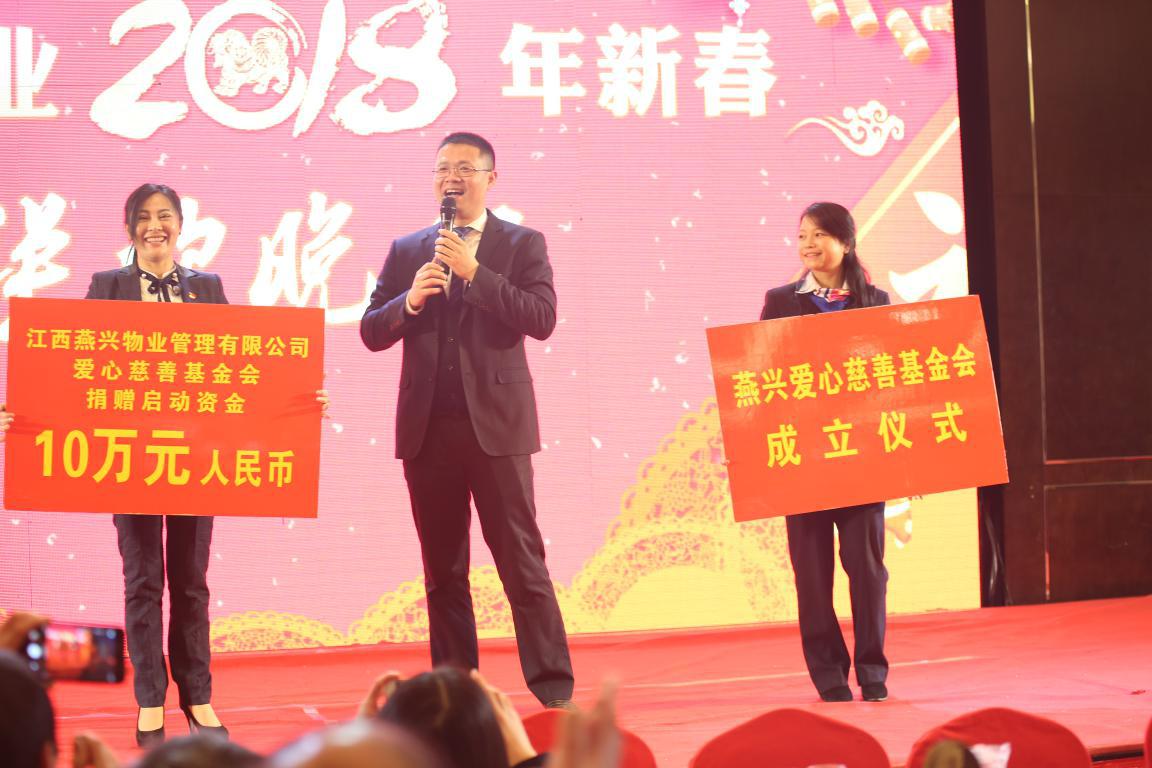 值得關注的是,本次晚會也是“燕興物業愛心慈善基金”的成立儀式。在晚會上,燕興物業愛心慈善基金會長夏峰介紹了基金會的基本情況,公司董事長劉燕代表江西燕興物業管理有限公司捐贈啟動資金10萬元。