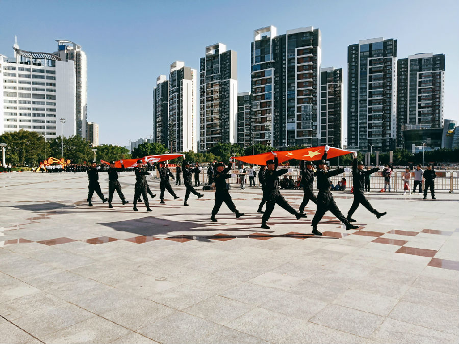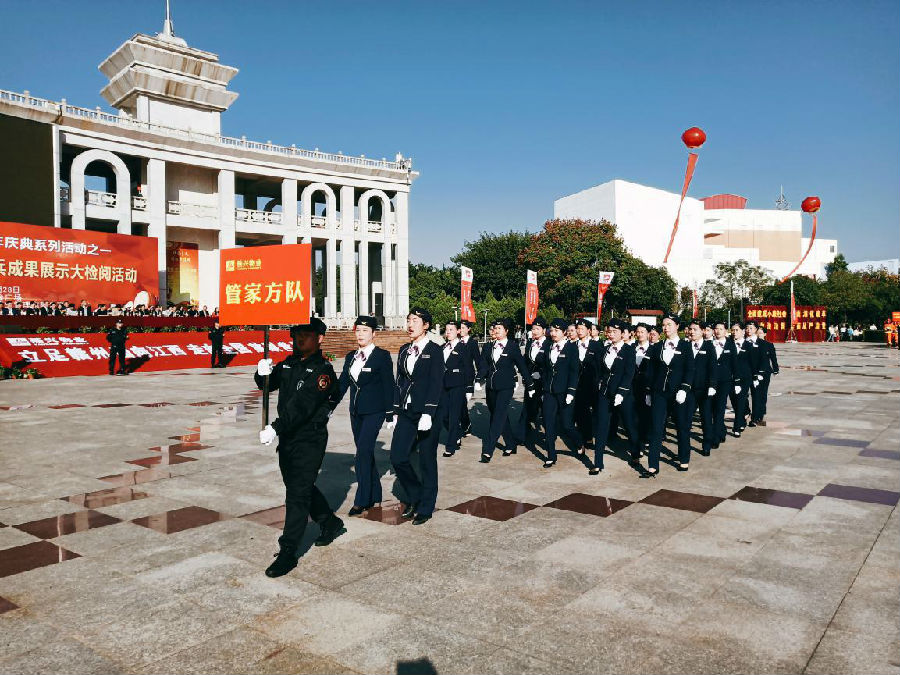 15時20分,黃金廣場艷陽高照,人聲鼎沸,大檢閱活動在莊嚴的《中華人民共和國國歌》聲中拉開帷幕。公司黨委副書記、總經理劉南斗首先發表熱情洋溢致辭。劉總指出:開展崗位練兵成果展示,是我們深入貫徹黨的十九大精神,落實“質量強國”發展戰略,堅持“質量第一”價值導向的重要行動,也是展現物業管理從業人員專業形象和精神風貌,踐行2018年物業管理行業服務質量提升年工作主題,更是增強優質物業服務供給能力、更好地滿足廣大業主對優質物業服務的需求,讓更多的人知道物業,讓更多人了解物業,讓更多的人支持物業的具體舉措。劉總表示,通過這次崗位練兵技能展示,我們要以練兵促提升,以展示促發展,創新行業人才培養、選拔、激勵機制,提高行業從業人員的專業能力和綜合素質,為物業行業轉型升級和高質量發展提供技術支撐和人才保障,讓物業成為有奔頭的產業,讓物業成為有吸引力的職業,讓物業成為讓人尊重的行業。