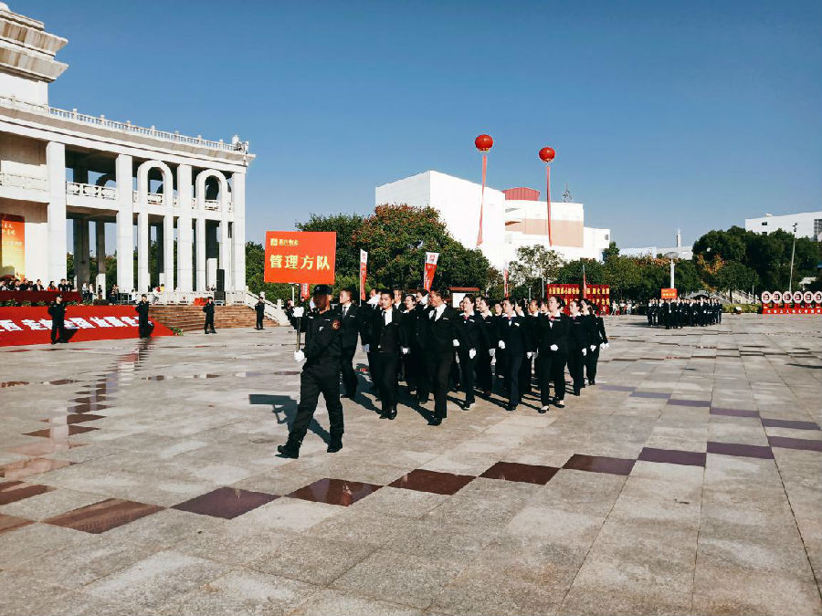 接著,在公司黨委書記、董事長劉燕的一聲令下,分列式演練展示和著《運動員進行曲》正式舉行。旗手陣隊、引路陣隊和黨員方隊、特勤方隊、應急方隊、管理方隊、管家方隊、義務消防方隊、保障方隊、環境管理方隊的隊員們,邁著矯健的步伐,精神抖擻地一一走過檢閱臺。他們步伐整齊劃一,氣勢威武雄壯,口號嘹亮,充分展現了燕興人蓬勃向上的精神面貌和昂揚奮發的工作斗志。