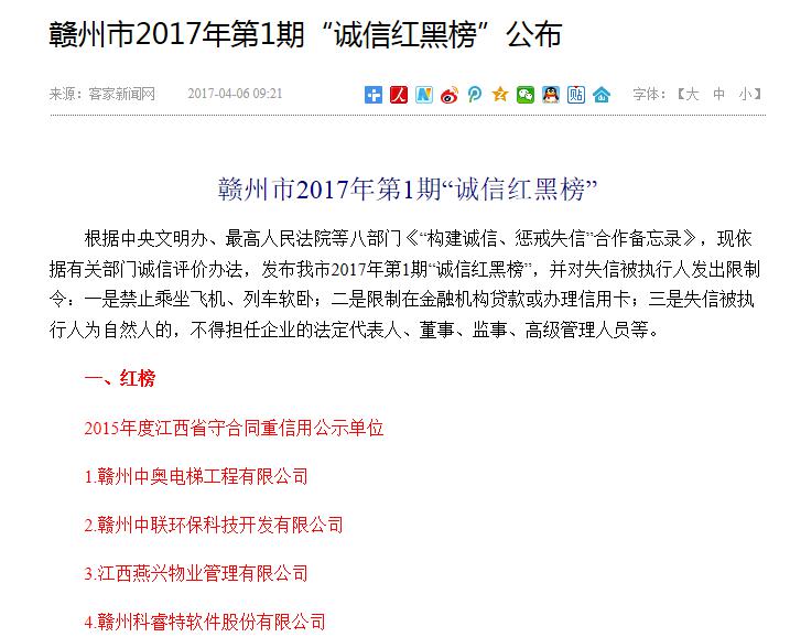 近日,贛州市精神文明建設指導委員會辦公室、贛州市工商行政管理局和贛州市中級人民法院聯合發布“贛州市2017年第1期‘誠信紅黑榜’”,江西燕興物業管理有限公司等40家公司上了紅榜,被評為“2015年度江西... 2017-04-11