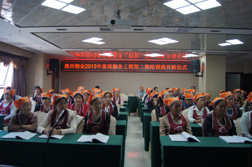燕興物業(yè)2013年家政工程一般家政員培訓(xùn)班開班了!上圖:區(qū)商務(wù)局有關(guān)領(lǐng)導(dǎo)參加開班儀式上圖:家政學(xué)員在認(rèn)真聽課上圖:家政學(xué)員上課 2014-10-14